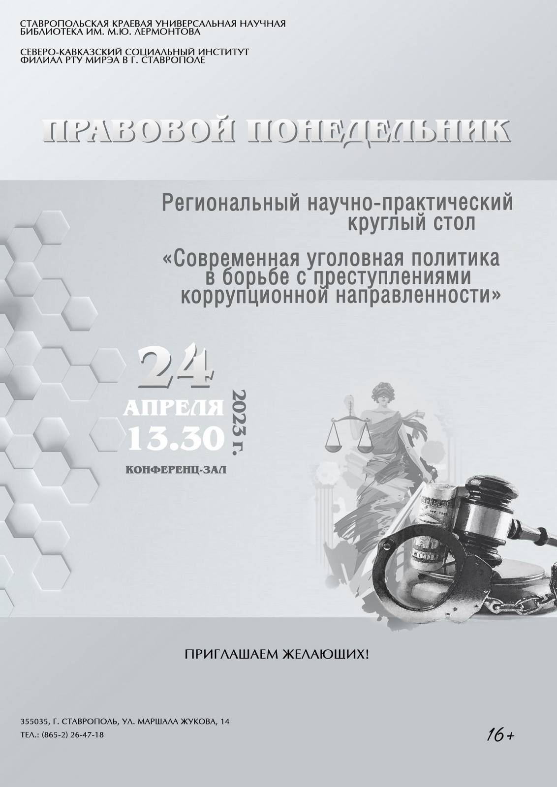 24 апреля 2023 года в 13 часов 30 минут, в рамках ежеквартального цикла «Правовой понедельник», в конференц-зале Ставропольской краевой научной библиотеки им. М. Ю. Лермонтова состоится региональный научно-практический круглый стол «Современная уголовная политика в борьбе с преступлениями коррупционной направленности».