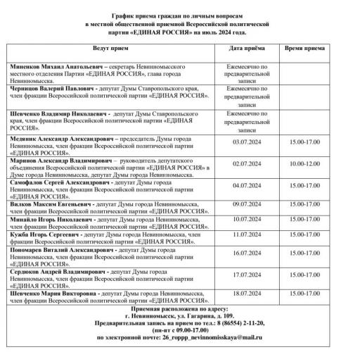 Размещаем график приёма граждан по личным вопросам в общественной приёмной Партии "Единая Россия" в июле 2024 года
