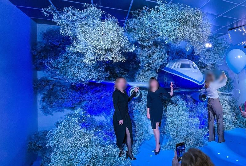 Входная группа из белых роз и гипсофилы, фужер игристого и небольшой букет хризантем встречали каждую представительницу прекрасного пола. С 8 утра мужчины уже начали поздравлять пребывающих на работу коллег.Задумка весьма необычная — имитация зала аэропорта. Организаторам пришлось заранее выставлять декорации, изменив цвет стен, потолка и пола. Кроме того, холл был украшен цветами и даже манекеном носовой части самолета.