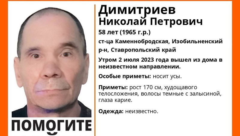 Утром 2 июня 58-летний Николай Петрович Дмитриев вышёл из дома и ушёл в неизвестном направлении. Ростом он 170 см, худощавого телосложения, волосы тёмные с залысиной, глаза карие. Носит усы.