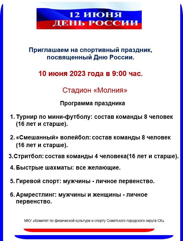 10 июня на стадиона "Молния" спортивный праздник, посвященный Дню России.