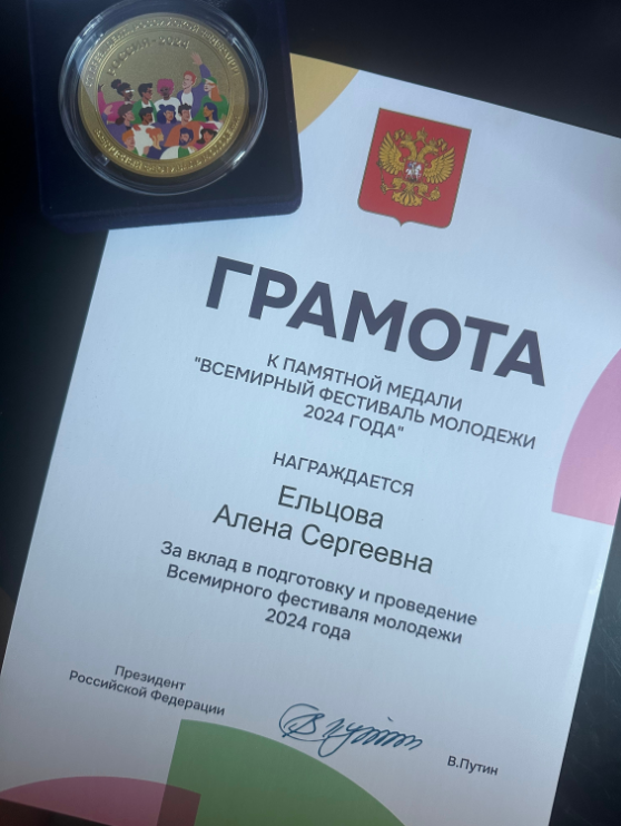В рамках Всемирного фестиваля молодежи и студентов 2024 года на главной сцене ВДНХ состоялась торжественная церемония чествования 40 лучших экскурсоводов и волонтеров. Среди награжденных - уроженка города Кисловодска Алена Ельцова. Кисловодчанке почетно вручили памятную медаль и грамоту Президента России.