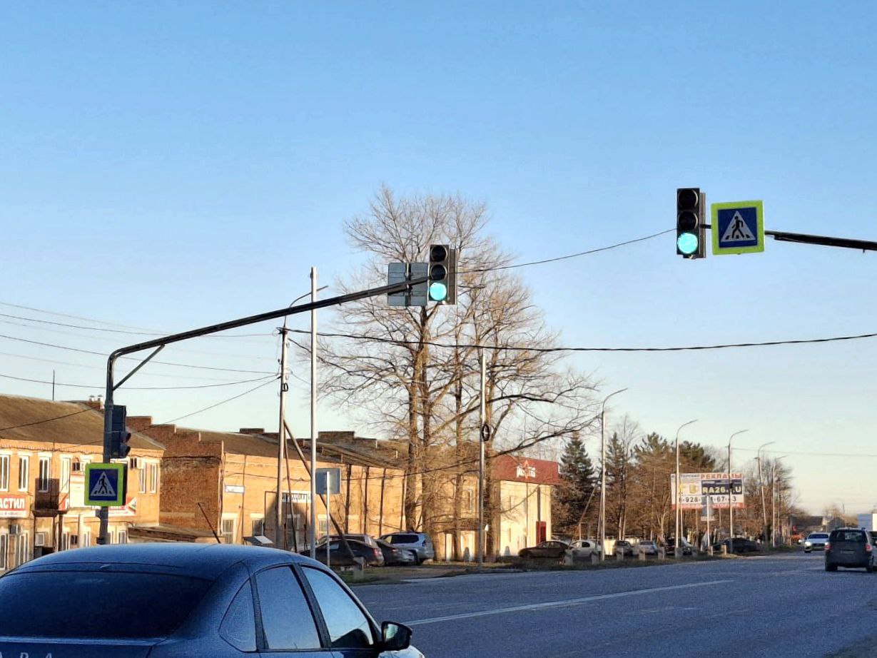 На улице Октябрьской, 141 в Георгиевске установлен работающий от солнечных батарей светофор, оборудованный вызывной кнопкой.