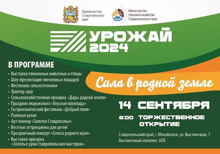 Приглашаем всех желающих на сельскохозяйственную выставку-ярмарку «Урожай-2024», которая пройдет 14 сентября 2024 года в Михайловске, Ставропольского края. Это событие станет важной вехой для аграриев и жителей региона, предлагая богатую программу и множество интересных мероприятий.