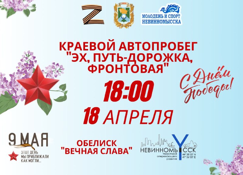 Завтра, 18 апреля, в 18:00 часов у Обелиска «Вечная Слава», город Невинномысск встречает краевой автопробег «Эх, путь-дорожка, фронтовая».