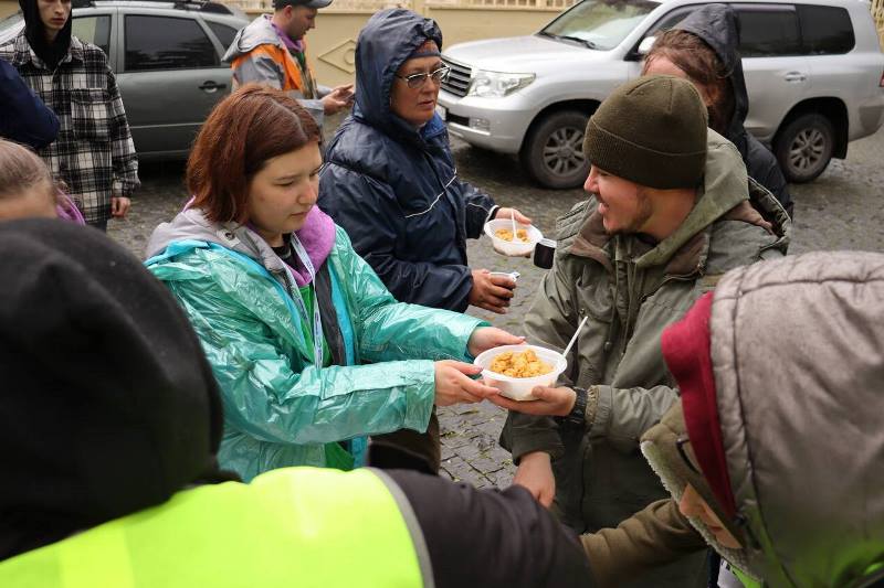 А после субботника всех участников угостили кашей - основным блюдом полевой кухни.