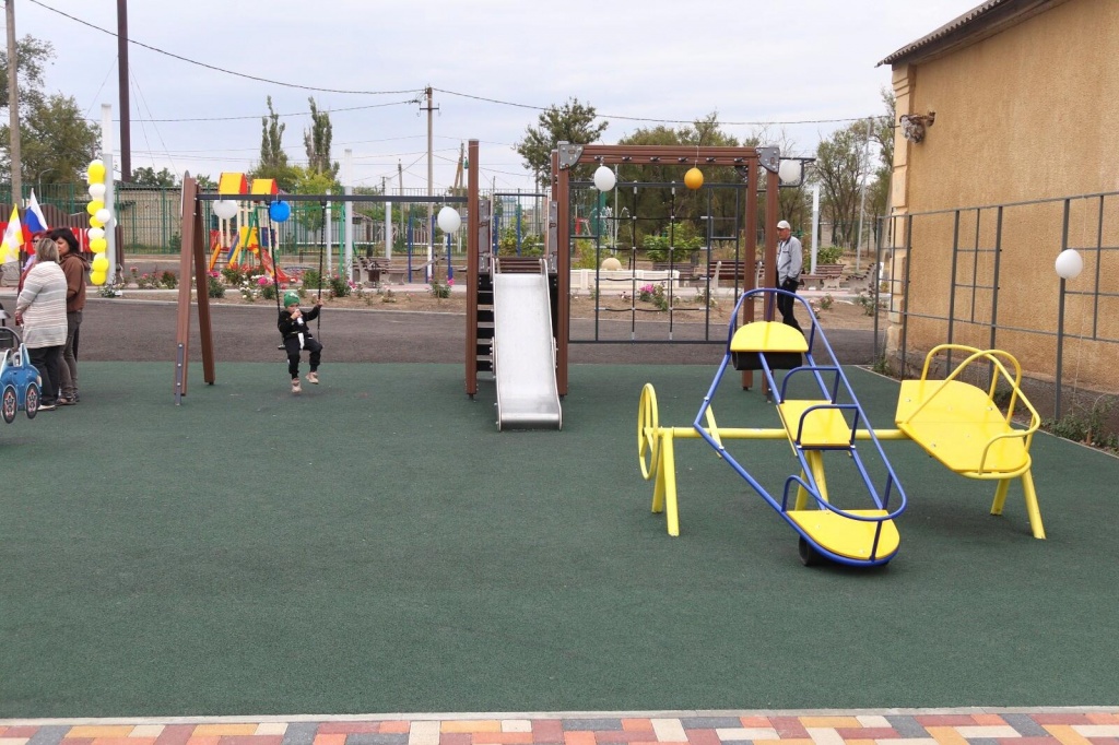 Подрядчиком была уложена тротуарная плитка, асфальтовое и резиновое покрытие, установлен детский игровой комплекс, две пружинные качалки и одна качалка-балансир, а также 15 металлических сооружений для плетистых растений и 6 светильников. Высажены липы, можжевельники, розы и кусты жимолости.