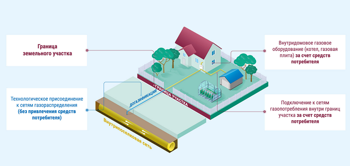 Догазификация (бесплатная, социальная газификация) распространяется на подключение индивидуальных жилых домовладений, принадлежащих на праве собственности заявителям – физическим лицам, в населенных пунктах, в которых уже проложены внутрипоселковые сети (полностью или частично), и требуется достроить газопроводы до границ земельных участков, на которых расположены такие домовладения. В данном случае газопровод подводится бесплатно до границы земельного участка, на котором расположен объект газификации. Газификация же касается тех населенных пунктов, до которых нужно еще построить магистральный и (или) межпоселковый газопровод по региональной программе газификации, внутрипоселковый газопровод, а уже потом обеспечить строительство сетей газораспределения до границ земельных участков заявителей.